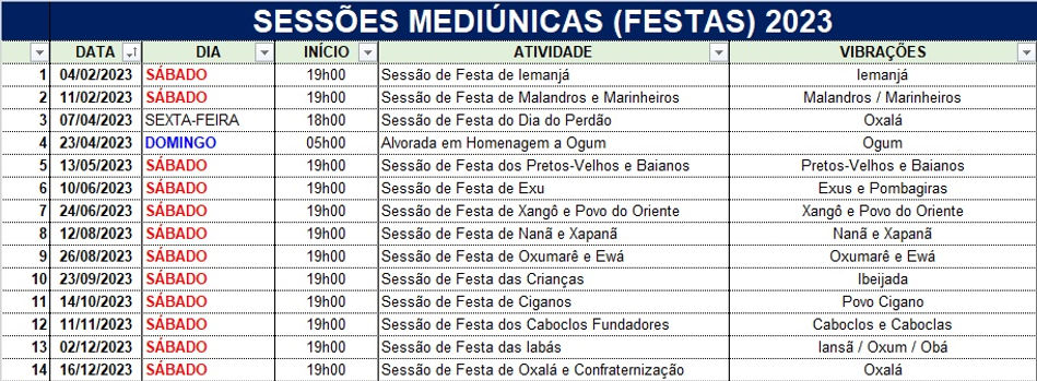 Já as sessões de festa (indicadas no calendário imediatamente abaixo) são públicas, podendo comportar assistência. Caso você deseje assistir a uma dessas festas, é necessário agendar a sua presença a partir das 14h00 da quarta-feira anterior à mesma, devido à limitação do espaço físico. Para isso, entre em contato com a secretaria pelo telefone indicado nesta página.